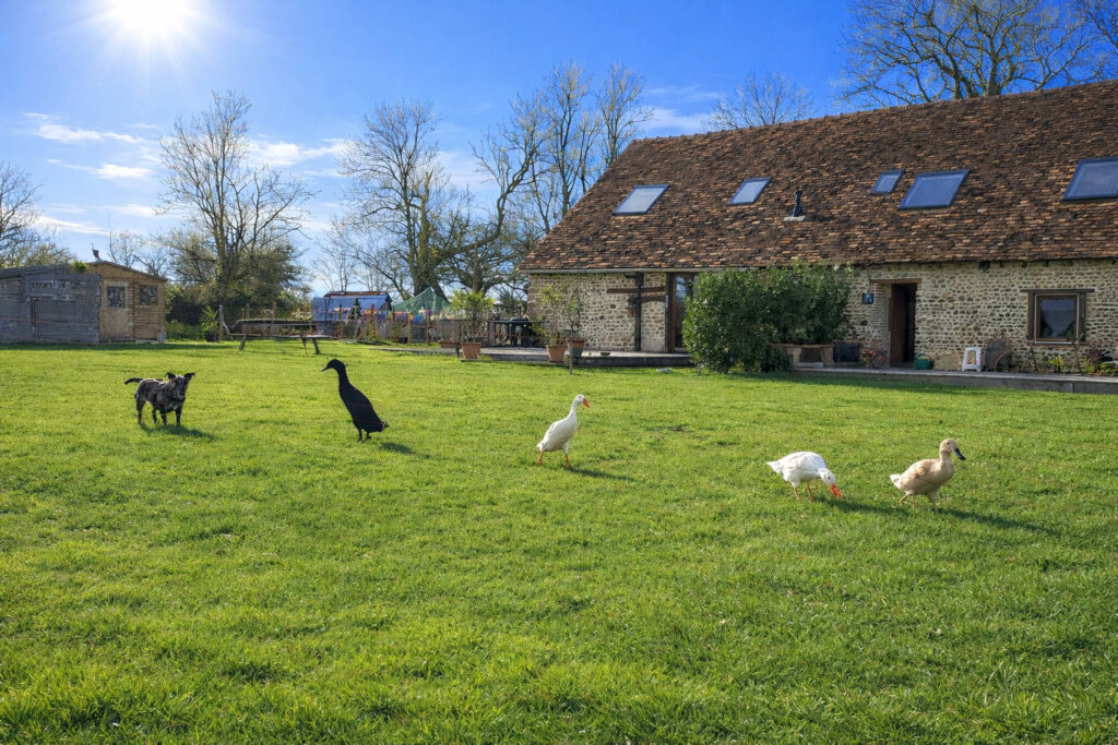 De ingang is aan de voorzijde. U logeert bij ons op het terrein, maar in de praktijk zullen we elkander amper treffen, alleen in het voorbijgaan. Aan de achterzijde van de gites bevindt zich een grote tuin van ca. 800m2, waar uw buitenleven zich zal afspelen. U kijkt uit op de landerijen en heeft toegang tot een (mogelijk gedeeld) opbouwzwembad 5,5 meter rond met zonneterras en diverse terrasjes, waaronder een prachtig vlonder aan de gite vast, waar u heerlijk kunt ontspannen.